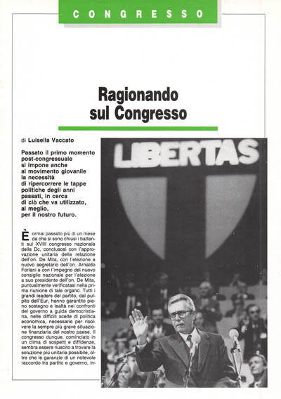 È ormai passato più di un mese da che si sono chiusi i battenti sul XVIII congresso nazionale della Dc, conclusosi con l'approvazione unitaria della relazione dell'on. De Mita, con l'elezione a nuovo segretario dell'on. Arnaldo Forlani e con l'impegno del nuovo consiglio nazionale per l'elezione a suo presidente dell'on. De Mita, puntualmente verificatasi nella prima riunione di tale organo. Tutti i grandi leaders del partito, dal pulpito dell'Eur, hanno garantito pieno sostegno e lealtà nei confronti del governo a guida democristiana, nelle difficili scelte di politica economica, necessarie per risolvere la sempre più grave situazione finanziaria del nostro paese. Il congresso dunque, cominciato in un clima di sospetti e diffidenze, sembra essere riuscito a trovare la soluzione più unitaria possibile, oltre che le garanzie di un notevole raccordo tra partito e governo, indispensabili per la credibilità della Dc agli occhi dei cittadini, che da tempo, chiedono una guida stabile, in grado di risolvere le gravi questioni che da anni tormentano il nostro paese, senza che governi di corto respiro, fossero in grado di porvi alcun rimedio. Gli stessi governi Craxi, del resto, pur contando sull'appoggio leale della Dc, oltre che su di una congiuntura internazionale favorevole per la caduta del prezzo del petrolio dovuta alla guerra lran-lrak e per la discesa del prezzo del dollaro, non hanno certo contribuito a non aumentare il già pesante debito pubblico. Ma, al di là del dovuto e necessario appoggio al governo De Mita, la prima cosa che, come militante e giovane dirigente di partito, mi aspetto dalla segreteria Forlani è un rasserenamento del clima interno alla Dc. L'atmosfera che ho vissuto nei primi giorni del congresso, i soli ai quali ho potuto essere presente, era quella del «terrore» seguito alla rivoluzione francese. Il giornaletto «il sabato» ormai noto per le sue uscite simili più ad una propaganda socialista che non a contributi al dibattito interno di un partito democratico cristiano, usava addirittura titoli del tipo «la tirannia è finita». Mi è difficile tuttavia pensare ad una tirannide nei confronti di chi, in questi anni, ha goduto di spazi prestigiosi all'interno del partito, pur mantenendo una libertà tale da consentire approcci con il Psi (vedi Rimini), con cui Cl dichiara di avere grandi affinità (forse sono mutate le posizioni socialiste sulla questione dell'aborto e più in generale del valore della vita umana?). Sentir parlare poi di tirannide da chi nei confronti degli altri giovani, lavorando all'interno delle scuole, delle università e del Mgdc, oltre che nel partito, si è spesso distinto per arroganza, intolleranza e superbia, ci è sembrato decisamente fuori luogo.