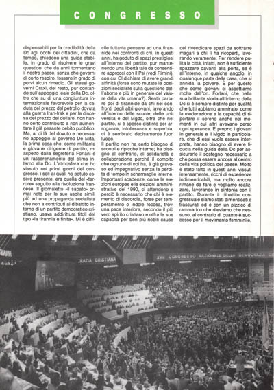 Il partito non ha certo bisogno di scontri e ripicche interne; ha bisogno al contrario, di solidarietà e collaborazione perché il compito che ognuno di noi ha, è già gravoso ed impegnativo senza la perdita di tempo in schermaglie interne. Importanti scadenze, come le elezioni europee e le elezioni amministrative del 1990, ci attendono e perciò è necessario che chi è elemento di discordia, forse per temperamento o indole focosa, trovi una pace interiore, secondo il più vero spirito cristiano e offra le sue capacità per ben più nobili cause del rivendicare spazi da sottrarre magari a chi li ha ricoperti, lavorando veramente. Per rendere pulita la città, infatti, non è sufficiente spazzare davanti alla porta, se è all'interno, in qualche angolo, in qualunque parte della casa, che si annida la polvere. E per questo che come giovani ci aspettiamo molto dall'on. Forlani, che nella sua brillante storia all'interno della Dc si è sempre distinto per qualità che tutti abbiamo ammirato, come la moderazione e la capacità di riportare il sereno anche nei momenti in cui altri avevano perso ogni speranza. E proprio i giovani in generale e il Mgdc in particolare, che di essi vuole essere interprete, hanno bisogno di avere fiducia nella guida della Dc per assicurarle il sostegno necessario a che possa essere ancora al centro della vita politica del paese. Molto è stato fatto in questi anni vissuti intensamente, ricchi di esperienze indimenticabili, ma molto ancora rimane da fare e vogliamo realizzare, lavorando in sintonia con il partito. Durante il dibattito congressuale siamo stati dimenticati e trascurati ed è con un pizzico di rammarico che rileviamo che nessuno, al contrario di quanto è successo per il movimento femminile, per cui sono state elette 20 donne nel consiglio nazionale del partito, abbia pensato ad un riconoscimento del ruolo del giovanile nel dibattito interno, chiedendo un contributo alla formulazione delle linee d'azione del partito, come avviene nel consiglio nazionale.