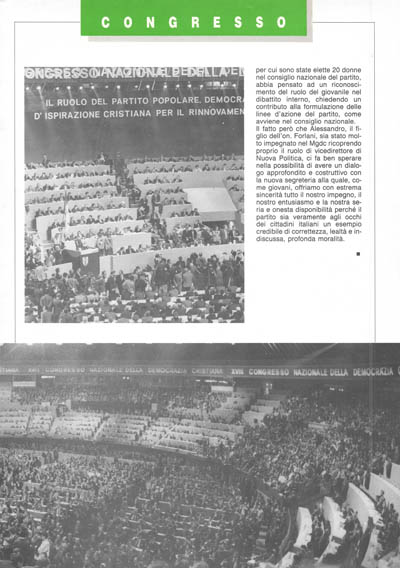 Il fatto però che Alessandro, il figlio dell'on. Forlani, sia stato molto impegnato nel Mgdc ricoprendo proprio il ruolo di vicedirettore di Nuova Politica, ci fa ben sperare nella possibilità di avere un dialogo approfondito e costruttivo con la nuova segreteria alla quale, come giovani, offriamo con estrema sincerità tutto il nostro impegno, il nostro entusiasmo e la nostra seria e onesta disponibilità perché il partito sia veramente agli occhi dei cittadini italiani un esempio credibile di correttezza, lealtà e indiscussa, profonda moralità.
