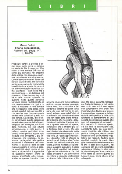 Predicare contro la politica è ormai cosa facile, ovvia e persino conveniente. Ma il mugugno, il fastidio di una società che non si sente più coinvolta nel progetto della politica non aiutano a «inventare una diversa arte di governo». Questo sembra essere il senso del libro di Marco Follini. Un libro che sembra un esame dei motivi della insoddisfazione attuale da parte di chi aveva concepito la politica come «un modo – non il solo ma il più importante – di dialogare col prossimo, di lasciare un segno di sé e delle proprie opinioni». In qualche modo questo percorso vorrebbe essere l'autobiografia di una degenerazione che oggi si ritrova a muoversi in una società che nonostante tutto cerca delle sintesi possibili dei suoi conflitti e che sembra non ritrovare queste sintesi nella politica di questo nostro tempo. La politica, dice Follini, per ritrovare questa capacità di sintesi «dovrà uscire dall'effimero, dal gioco dell'immagine, dal rifiuto della memoria, dal suo attuale sbriciolamento in mille pezzi». Il palazzo mostra pericolosi scricchiolii; il ceto politico appare «più insicuro che arrogante, più improvvisato che stratega». In sostanza i protagonisti della politica accusano il malessere dell'isolamento, il black-out della società ma non riescono a venirne a capo. La credibilità degli uomini di governo e di partito si è appannata (la questione morale, anche se spesso amplificata oltre misura, anche se spesso brandita come un'arma impropria nella battaglia politica, ma pur sempre una questione vera, ha contribuito a far perdere al sistema dei partiti tanta parte del suo patrimonio di consensi). Adesso, conclude Follini, ci si muove in una fase di transizione che non riesce però a fare intravedere identità che non siano «provvisorie e indefinite». L'autore arriva a queste conclusioni aperte, conclusioni che si affidano più «alla fantasia degli eventi» che alle esercitazioni da laboratorio: nella convinzione che comunque la politica resta un «passaggio inevitabile». «Qualche volta si affaccia la tentazione di illudersi che l'insieme dei fatti della vita sociale, culturale, perfino mondana e spettacolare possano prendere il posto degli attuali equilibri del potere. Oppure l'altra tentazione che ci si possa chiudere in una dimensione più intima e raccolta, mettendosi al riparto dalle intemperie politiche. Ma sono, appunto, tentazioni». Dalle «tentazioni» si può uscire con codici non scritti, con regole non burocratiche, con ordini non imperativi che devono pur essere immaginati per ricomporre la figurazione della politica e farla corrispondere ai cambiamenti di una società. È un bisogno questo, che non può appagarsi di surrogati.
