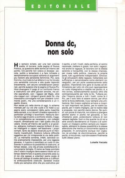 Ho sempre evitato, per una ben precisa scelta, di toccare, sulle pagine di Nuova Politica, la questione delle donne all'interno del partito. Ciò perché non volevo si dicesse: «eccola, subito a lamentarsi o a fare richieste o semplicemente occuparsi soltanto di argomenti più inerenti alla sensibilità femminile. Poi, cara Corvina, è arrivata la tua lettera in cui ho trovato una sensibilità comune e alla quale rispondo brevemente, con alcune considerazioni personali, perché auspico che le pagine di Nuova Politica divengano il luogo di un confronto franco e costruttivo con altre giovani amiche, ma anche soprattutto, con i ragazzi del Mgdc, oltre che magari con i dirigenti grandi della Dc, che intendiamo coinvolgere non per chiedere «umilmente posti», ma una considerazione e un rispetto diversi.