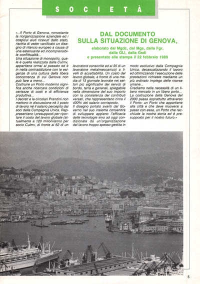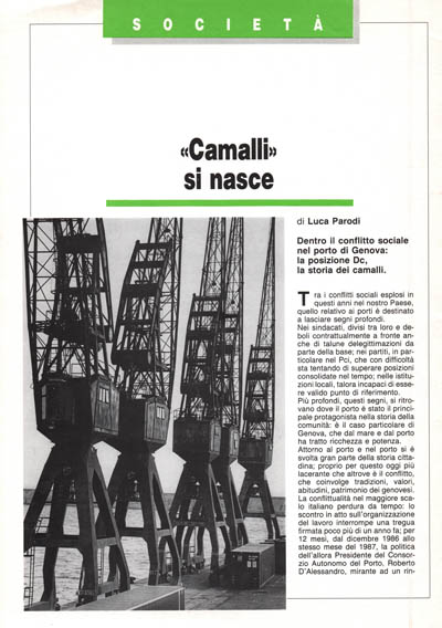 Attorno al porto e nel porto si è svolta gran parte della storia cittadina; proprio per questo oggi più lacerante che altrove è il conflitto, che coinvolge tradizioni, valori, abitudini, patrimonio dei genovesi. La conflittualità nel maggiore scalo italiano perdura da tempo: lo scontro in atto sull'organizzazione del lavoro interrompe una tregua firmata poco più di un anno fa; per 12 mesi, dal dicembre 1986 allo stesso mese del 1987, la politica dell'allora Presidente del Consorzio Autonomo del Porto, Roberto D'Alessandro, mirante ad un rinnovamento aziendalistico e manageriale, si era contrapposta a quella di Paride Satini, Console della Compagnia Unica, impegnato in una difesa ad oltranza dello satus quo, dal quale derivano privilegi e poteri.