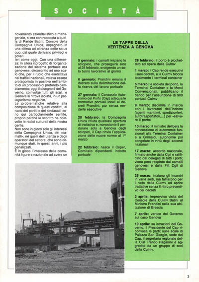 | 20 febbraio | la Compagnia Unica rifiuta qualsiasi apertura di trattativa e, nonostante il perdurare solo a Genova degli scioperi, il Cap rinvia l'applicazione delle nuove norme al 1° marzo |