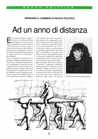 Certo, le questioni economiche che riguardano l'autofinanziamento della nostra rivista, ci impongono ulteriori sforzi, che chiamano in causa tutti gli amici, delegati e non, iscritti e non, per contribuire, con il loro sostegno, alla vita di Nuova Politica. In questo arco di tempo, abbiamo cercato di rilanciare quello che in questi anni, da Maiori in poi, è stato il principale strumento di dialogo e di confronto tra il centro nazionale e tutti gli amici che si impegnano in periferia. E proprio perché vogliamo mantenere e potenziare questo filo diretto, tra le diverse esperienze dei nostri iscritti, questo numero avrà una tiratura di gran lunga superiore alle copie stampate in precedenza. Per questo, altri amici avranno la possibilità di usufruire di un utile strumento di formazione e di informazione, per il proprio lavoro e per la propria preparazione politica.