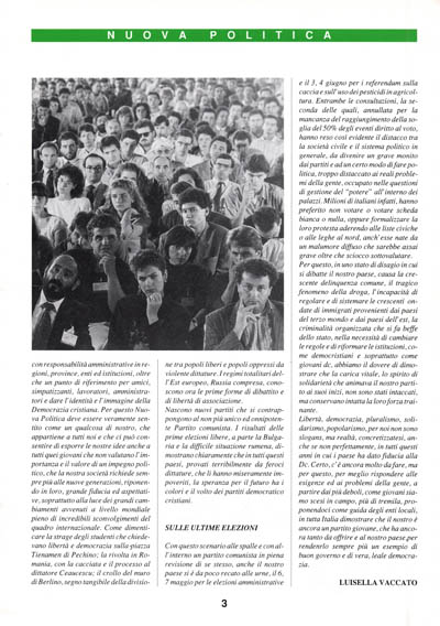 Questo giornale vuole essere infatti un "contenitore" di dibattito, confronto ed informazione per le strategie di rinnovamento, sviluppo, progresso, oltre che di gestione economica, amministrativa e politica del territorio negli anni '90. Così come vuole essere sempre più il portavoce degli uomini e dei giovani con responsabilità amministrative in regioni, province, enti ed istituzioni, oltre che un punto di riferimento per amici, simpatizzanti, lavoratori, amministratori e dare l'identità e l'immagine della Democrazia cristiana. Per questo Nuova Politica deve essere veramente sentito come un qualcosa di nostro, che appartiene a tutti noi e che ci può consentire di esporre le nostre idee anche a tutti quei giovani che non valutano l' importanza e il valore di un impegno politico, che la nostra società richiede sempre più alle nuove generazioni, riponendo in loro, grande fiducia ed aspettative, soprattutto alla luce dei grandi cambiamenti avvenuti a livello mondiale pieno di incredibili sconvolgimenti del quadro internazionale. Come dimenticare la strage degli studenti che chiedevano libertà e democrazia sulla piazza Tienamen di Pechino; la rivolta in Romania, con la cacciata e il processo al dittatore Ceaucescu; il crollo del muro di Berlino, segno tangibile della divisione tra popoli liberi e popoli oppressi da violente dittature. I regimi totalitari dell'Est europeo, Russia compresa, conoscono ora le prime forme di dibattito e di libertà di associazione.