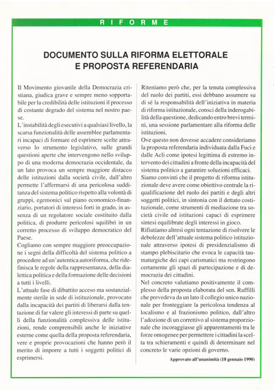 Ove questo non dovesse accadere consideriamo la proposta referendaria individuata dalla Fuci e dalle Acli come ipotesi legittima di estremo intervento dei cittadini a fronte della incapacità del sistema politico a garantire soluzioni efficaci. Siamo convinti che il progetto di riforma istituzionale deve avere come obiettivo centrale la riqualificazione del ruolo dei partiti e degli altri soggetti politici, in sintonia con il dettato costituzionale, come strumenti di mediazione tra società civile ed istituzioni capaci di esprimere sintesi equilibrate degli interessi in gioco.