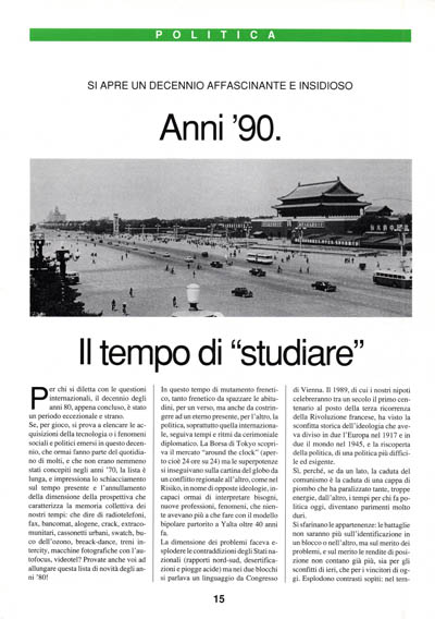 In questo tempo di mutamento frenetico, tanto frenetico da spazzare le abitudini, per un verso, ma anche da costringere ad un eterno presente, per l'altro, la politica, soprattutto quella internazionale, seguiva tempi e ritmi da cerimoniale diplomatico. La Borsa di Tokyo scopriva il mercato "around the clock" (aperto cioè 24 ore su 24) ma le superpotenze si inseguivano sulla cartina del globo da un conflitto regionale all'altro, come nel Risiko, in nome di opposte ideologie, incapaci ormai di interpretare bisogni, nuove professioni, fenomeni, che niente avevano più a che fare con il modello bipolare partorito a Yalta oltre 40 anni fa.