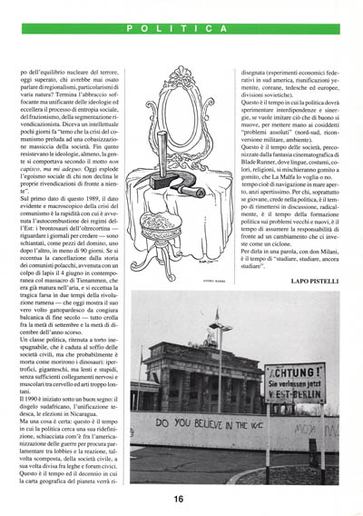 Questo è il tempo delle società, preconizzate dalla fantasia cinematografica di Blade Runner, dove lingue, costumi, colori, religioni, si mischieranno gomito a gomito, che La Malfa lo voglia o no. tempo cioè di navigazione in mare aperto, anzi apertissimo. Per chi, soprattutto se giovane, crede nella politica, è il tempo di rimettersi in discussione, radicalmente, è il tempo della formazione politica sui problemi vecchi e nuovi, è il tempo di assumere la responsabilità di fronte ad un cambiamento che ci investe come un ciclone.