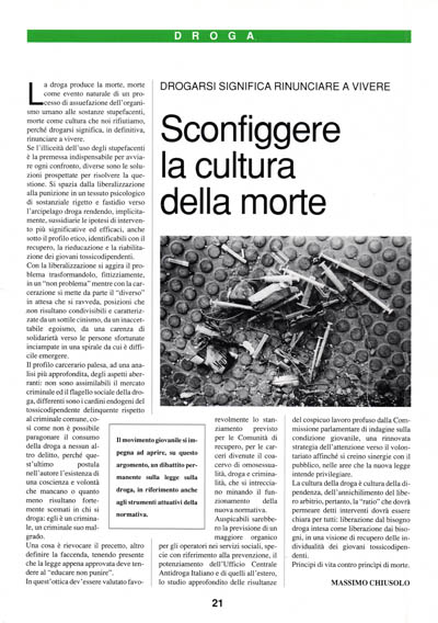 La droga produce la morte, morte come evento naturale di un processo di assuefazione dell 'organismo umano alle sostanze stupefacenti, morte come cultura che noi rifiutiamo, perché drogarsi significa, in definitiva, rinunciare a vivere.