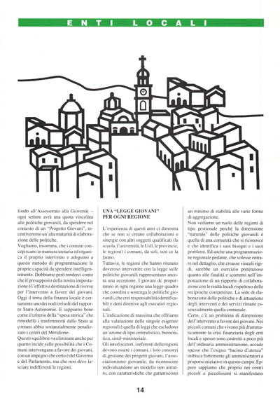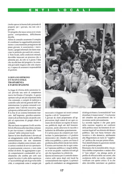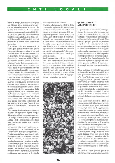 É in queste realtà che vanno fatti gli sforzi più grandi ponendo alla prova l'impegno di una generazione di giovani amministratori che nei centri minori trova più spazio per un graduale avvicendamento del "personale politico". Bisogna vincere la sfida contro le risorse esigue e i bacini d'utenza troppo ristretti. Ma i nemici veri delle politiche giovanili nelle piccole comunità sono la mancanza di cultura della programmazione e l'ombra del campanile che "disturba" la collaborazione tra centri diversi. La strada che indicano i giovani dc è quella delle sinergie da cercare, del lavorare insieme, della costituzione di consorzi, della stipula di convenzioni e di accordi di programma (queste ultime opportunità offerte e caldeggiate dalla legge di riforma delle Autonomie locali). Cominciamo a pensare alle politiche giovanili come ad un "bene" da offrire alla comunità, che i comuni si attrezzano a gestire con forme istituzionali ad hoc, come già fanno per l'acqua, il territorio, i piani turistici, i trasporti, la sanità.
