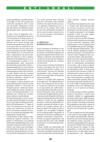 Si tratta invece di approntare sedi e strutture in cui il tempo libero dei giovani non coincida con il tempo vuoto o col tempo del consumo, spazi di riunione attrezzati per le diverse attività: dagli incontri culturali alla lettura, dall'ascolto di musica alla sua "produzione" per le band giovanili che non sanno dove provare e registrare, sino alle videoteche e alle strutture dove le associazioni abbiano a disposizione una piccola tipografia da utilizzare a turno e gratuitamente per le loro pubblicazioni. La scelta che proponiamo ai comuni è la responsabilizzazione delle associazioni giovanili nelle gestioni delle strutture, e la garanzia degli accessi concreti ad una fascia di utenti effettivamente giovani. Altrimenti può accadere che chi usufruisce delle strutture siano più i trentenni urbani sicuri della loro condizione che i diciottenni intimiditi e distanti da un servizio che non sentono loro.