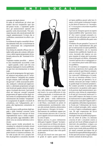I giovani dc propongono che ogni regione istituisca una propria rete di "terminali di bilancio" attingibili dai cittadini di ogni comune, nelle sedi degli "informa giovani" e delle associazioni politiche, sindacali e culturali più rappresentative; e altrettanto proponiamo ad ogni ente locale per quanto attiene le proprie spese e le proprie decisioni. I giovani dc eletti nei rinnovati consigli comunali proporranno all'approvazione degli statuti norme di comportamento delle amministrazioni che rendano "trasparenti" le assegnazioni di appalti e incarichi di consulenza, con l'adeguamento, per i primi, alla legislazione comunitaria in materia.