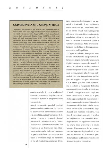 2. Organi accademici. Per quanto attiene alla strutturazione del potere all'interno dei singoli atenei rileviamo come il più importante organo decisionale, il Senato accademico, risulti monoliticamente composto da soli docenti ordinari. Inoltre, sempre alla docenza ordinaria è riservata una posizione privilegiata di maggioranza precostituita nei C.d.A. In tale quadro è facile capire come si sostanzi la marginalità delle altre componenti, tra cui quella studentesca.