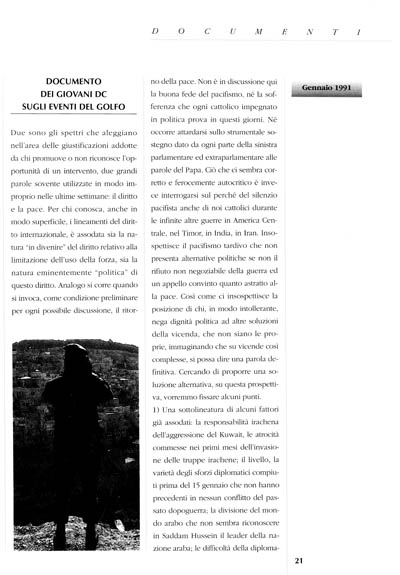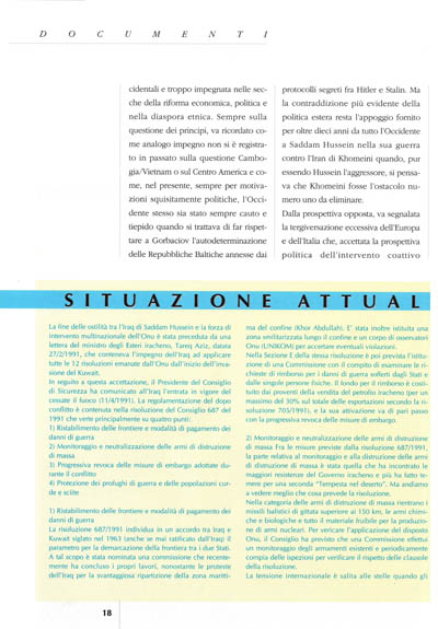 1. Una sottolineatura di alcuni fattori già assodati: la responsabilità irachena dell'aggressione del Kuwait, le atrocità commesse nei primi mesi dell'invasione delle truppe irachene; il livello, la varietà degli sforzi diplomatici compiuti prima del 15 gennaio che non hanno precedenti in nessun conflitto del passato dopoguerra; la divisione del mondo arabo che non sembra riconoscere in Saddam Hussein il leader della nazione araba; le difficoltà della diplomazia occidentale tradizionale nei confronti di un islamismo che vede nella jihad islamica la coronazione più alta del proprio scontro con il Nord del mondo; la volontà irachena – ricorrente nel tempo, fin dagli anni '60 – di impossessarsi di uno Stato mai riconosciuto politicamente fin dalle origini.