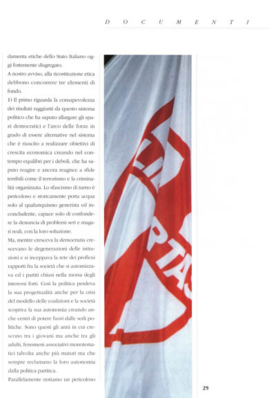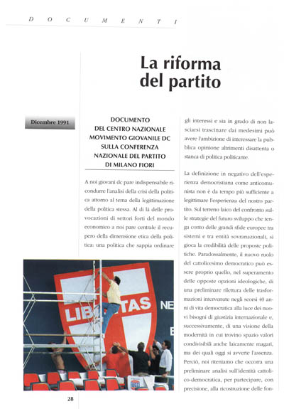 La definizione in negativo dell'esperienza democristiana come anticomunista non è da tempo più sufficiente a legittimare l'esperienza del nostro partito. Sul terreno laico del confronto sulle strategie del futuro sviluppo che tenga conto delle grandi sfide europee tra sistemi e tra entità sovranazionali, si gioca la credibilità delle proposte politiche. Paradossalmente, il nuovo ruolo del cattolicesimo democratico può essere proprio quello, nel superamento delle opposte opzioni ideologiche, di una preliminare rilettura delle trasformazioni intervenute negli scorsi 40 anni di vita democratica alla luce dei nuovi bisogni di giustizia internazionale e, successivamente, di una visione della modernità in cui trovino spazio valori condivisibili anche laicamente magari, ma dei quali oggi si avverte l'assenza. Perciò, noi riteniamo che occorra una preliminare analisi sull'identità cattolico-democratica, per partecipare, con precisione, alla ricostruzione delle fondamenta etiche dello Stato Italiano oggi fortemente disgregato.