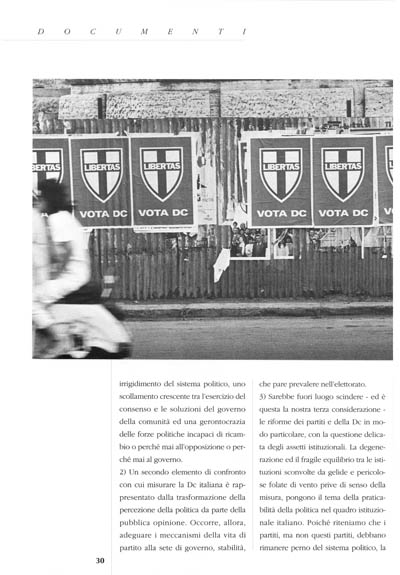 1) È necessario, infatti, far seguire all'autoriforma del Partito una riforma delle Istituzioni e della legge elettorale che ricrei effettivamente l'equazione consenso, potere, responsabilità; ogni autoriforma della Dc, che non sia seguita a breve termine da tali modifiche, si rivelerebbe effimera o nella migliore delle ipotesi di scarsa incisività.