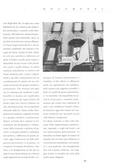 3. Sarebbe fuori luogo scindere – ed è questa la nostra terza considerazione – le riforme dei partiti e della Dc in modo particolare, con la questione delicata degli assetti istituzionali. La degenerazione ed il fragile equilibrio tra le istituzioni sconvolte da gelide e pericolose folate di vento prive di senso della misura, pongono il tema della praticabilità della politica nel quadro istituzionale italiano. Poiché riteniamo che i partiti, ma non questi partiti, debbano rimanere perno del sistema politico, la nostra opzione sul tema delle riforme elettorali va alle proposte che, garantendo la rappresentatività, stimolino, con correttivi sostanzialmente maggioritari, la formazione delle coalizioni responsabilizzandole. Ma poiché non siamo per soluzioni autoritarie, mentre matura (speriamo non sia già tardi!) la consapevolezza della urgente riforma elettorale, non possiamo rinunciare ad una modifica sostanziale delle regole del gioco dentro i partiti. Noi crediamo che la Dc possa autoriformarsi ma avvertiamo gli adulti del partito che per molti di noi Milano rappresenta un appuntamento finale, una sorta di resa dei conti.