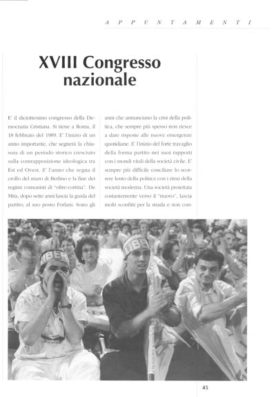 È il diciottesimo congresso della Democrazia Cristiana. Si tiene a Roma, il 18 febbraio del 1989. È l'inizio di un anno importante, che segnerà la chiusura di un periodo storico cresciuto sulla contrapposizione ideologica tra Est ed Ovest. È l'anno che segna il crollo del muro di Berlino e la fine dei regimi comunisti di "oltre-cortina". De Mita, dopo sette anni lascia la guida del partito; al suo posto Forlani. Sono gli anni che annunciano la crisi della politica, che sempre più spesso non riesce a dare risposte alle nuove emergenze quotidiane. È l'inizio del forte travaglio della forma partito nei suoi rapporti con i mondi vitali della società civile. È sempre più difficile conciliare lo scorrere lento della politica con i ritmi della società moderna. Una società proiettata costantemente verso il "nuovo", lascia molti sconfitti per la strada e non contempla tutti gli interessi: è l'agonia della politica, che muore se non riesce a recuperare la sua funzione di indirizzo, anche e soprattutto nella ricerca del nuovo.