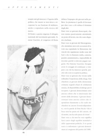 Dare voce ai giovani che vivono nella solitudine l'esperienza della droga. Essi chiedono ai giovani della democrazia cristiana segnali chiari di solidarietà umana, di disponibilità al dialogo per il recupero. I giovani democristiani sono ancora coloro che si interessano dei motivi della devianza. I giovani democristiani sono ancora coloro che rispondono duramente a chi vuole rinchiudere in carcere il tossicodipendente, con le parole di Don Picchi "Chi si buca non ha paura né del carcere, né di morire, ma ha solo paura di vivere". Dare voce a chi non ha voce significa farsi carico degli squilibri mondiali e delle oppressioni politiche. E su questi temi si confrontano i giovani democristiani al congresso del partito del 1989.