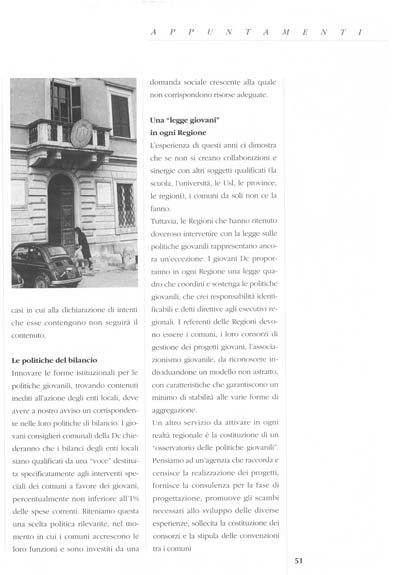 Si aggirano in Italia molti falsi Assessorati alla Gioventù, che non coordinano nessuna azione o che al massimo gestiscono una sommatoria di interventi scollegati, non un "Progetto Giovani" coerente e impostato su un fecondo metodo di programmazione. Questo rischio si verifica soprattutto nei comuni più piccoli, dove difficilmente quella alla gioventù si presenta come una delega esclusiva di un'assessorato – come accade nei centri più grandi – ma come attribuzione che si aggiunge ad altre competenze. Poichè i giovani Dc credono all'innovazione istituzionale delle politiche giovanili, denunceremo quei casi in cui alla dichiarazione di intenti che esse contengono non seguirà il contenuto.