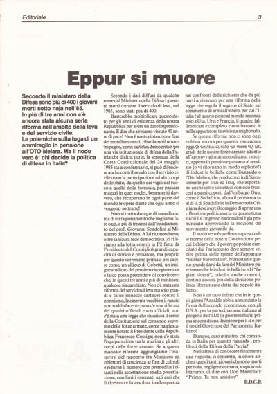 Basterebbe moltiplicare questo dato per gli anni di esistenza della nostra Repubblica per avere un dato impressionante. E dire che abbiamo vissuto 40anni di pace! Non è nostra intenzione fare del moralismo anzi, ribadiamo il nostro impegno, come cattolici democratici per una via istituzionale di difesa della Patria che d'altra parte, la sentenza della Corte Costituzionale del 24 maggio 1985 sta a confermarlo, si può difendere anche contribuendo con il servizio civile o con la partecipazione ad altri corpi dello stato, da quello dei vigili del fuoco a quello della forestale, per passare magari in quei nuclei, benemeriti davvero, che recuperano in ogni parte del mondo le opere d'arte che ogni anno ci vengono sottratte!