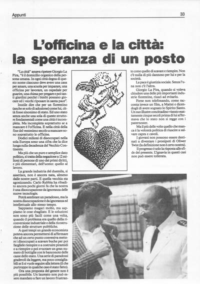 "La città'' amava ripetere Giorgio La Pira, "è il domicilio organico della persona umana. In ogni città degna di questo nome ciascuno deve avere una casa per amare, una scuola per imparare, una officina per lavorare, un ospedale per guarire, una chiesa per pregare e poi tanti giardini perché i bimbi possano giocare ed i vecchi riposare in santa pace''. Inutile dire che per un fiorentino (anche se solo di adozione) come lui, città fosse sinonimo di stato. Ed uno stato senza anche una sola di queste strutture fondamentali come una città. è incompleta. Ma incompleta soprattutto se a mancare è l'officina. E nella città della fine del ventesimo secolo a mancare sono soprattutto le officine.