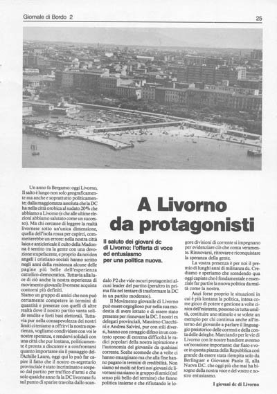 Siamo un gruppo di amici che non può certamente competere in termini di quantità e presenze con quelli di altre realtà dove il nostro partito vanta solide rendite e forti basi elettorali. Tuttavia pur nella consapevolezza dei nostri limiti ci teniamo a offrirvi la nostra esperienza, vogliamo condividere con voi le nostre speranze, e rendervi solidali con una città che pur lontana, politicamente è pronta a discutere e a confrontarsi quanto importante sia il passaggio dell'Achille Lauro, oggi qui lo può far capire il fatto che il nostro ex-segretario provinciale è stato incriminato e sospeso dal partito per traffico d'armi e che solo qualche anno fa la DC livornese fu sul punto di sparire travolta dallo scandalo P2 che vide oscuri protagonisti alcuni leader del partito (peraltro in prima fila nel tentare di trasformare la DC in un partito moderato).
