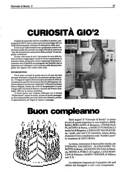 Fra le tante curiosità di questa nave ce n'è una che oltre ad essere divertente e piacevole è sicuramente salutare: la sauna. "Il bagno di vapore disintossicante permette di effettuare trattamenti specifici di numerosi disturbi dell'apparato cardiocircolatorio locomotore e digerente'' afferma il professor Enrico Malizia, titolare del corso di insegnamento in tossicologia dell'Università di Roma e vincitore del Premio Scarfoglio 1985 per la ricerca scientifica.