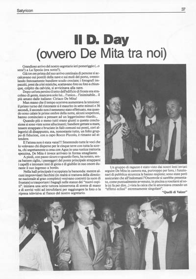 Un gruppo di ragazze è stato visto dai nostri lesti inviati seguire De Mita in camera ma, purtroppo per loro, i funzionari di pubblica sicurezza le hanno respinte; sono state però assicurate che all'indomani l'Onorevole si sarebbe presentato, come puntualmente avvenuto, in piscina a rosolarsi al sole (si fa per dire...) vista la calca che lo attorniava creando un "effetto eclissi" estremamente singolare''.