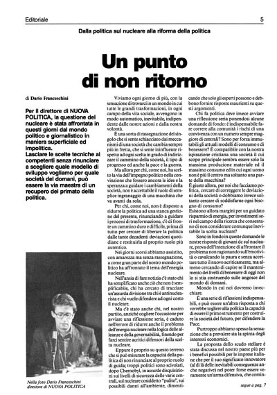 Sono in fondo in queste domande le nostre risposte di giovani dc sul nucleare, prova dell'intenzione di affrontare il problema non ragionando sull'emotività o cavalcando la paura e senza accettare tutto il nuovo acriticamente, ma almeno cercando di capire se il mantenimento dei livelli di benessere di oggi non lo si stia costruendo sulle angosce del mondo di domani.