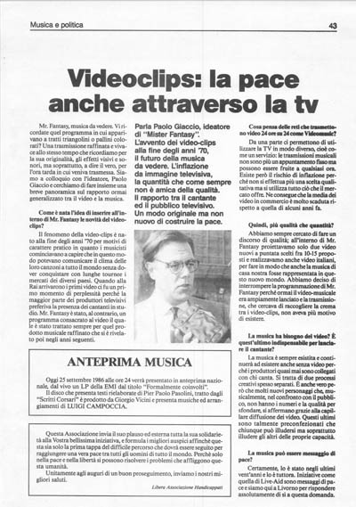 Mr. Fantasy, musica da vedere. Vi ricordate quel programma in cui apparivano a tratti triangolini o pallini colorati? Una trasmissione raffinata e vivace allo stesso tempo che ricordiamo per la sua originalità, gli effetti visivi e sonori, ma soprattutto, a dire il vero, per l'ora tarda in cui veniva trasmessa. Siamo a colloquio con l'ideatore, Paolo Giaccio e cerchiamo di fare insieme una breve panoramica sul rapporto ormai generalizzato tra il video e la musica.