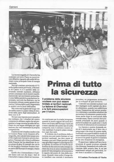 È evidente che il problema della sicurezza non può essere limitato ai vari territori nazionali, ma deve essere affrontato con tutti i Paesi poiché in ogni caso gli effetti negativi coinvolgono tutto il globo. Il comitato di Viterbo ha affrontato la discussione sulla energia nucleare da circa un anno, inizialmente dal punto di vista energetico ed economico, in seguito dal punto di vista della sicurezza. Quando viene scelto il luogo dove insediare una centrale è necessario prevedere un programma economico per lo sviluppo di quel territorio.