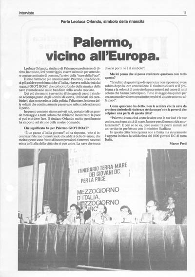 Leoluca Orlando, sindaco di Palermo e professore di diritto, ha voluto, ieri pomeriggio, essere sul molo per attendere con un centinaio di persone, l'arrivo della "nave della Pace''. È stato l'attracco più emozionante: Palermo, una delle città più calde e problematiche d'Italia, riceveva solidarietà dai ragazzi GIO'2 Boat che col sottofondo della musica della nave sventolavano mille bandiere dello scudo crociato.