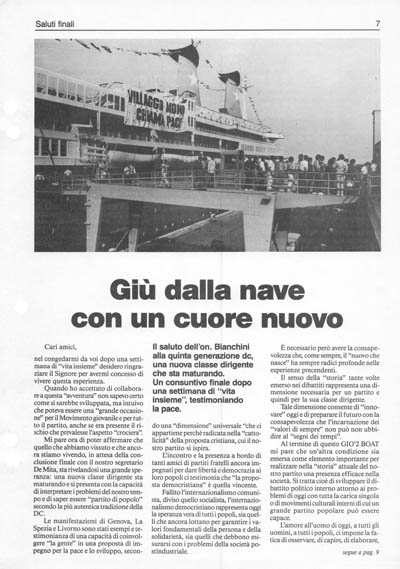 Per un partito che affonda le radici della sua proposta politica nell'ispirazione cristiana, pur essendo e dovendo essere laico nella elaborazione della proposta politica, la sua capacità di incidenza è legata ad una "prassi di comportamento" che trova nell'amicizia e nella libertà dei cuori il necessario presupposto. Ecco con questi pensieri "abbandoniamo la nave" e ritorniamo tutti nel mondo: se ci resta un po' di nostalgia "perché stavamo bene insieme'' ci conforta la speranza che tutta Italia sarà presto investita da "1.000 giovani missionari" desiderosi di spender la propria vita, attraverso la DC al servizio dell'uomo e della solidarietà tra i popoli.