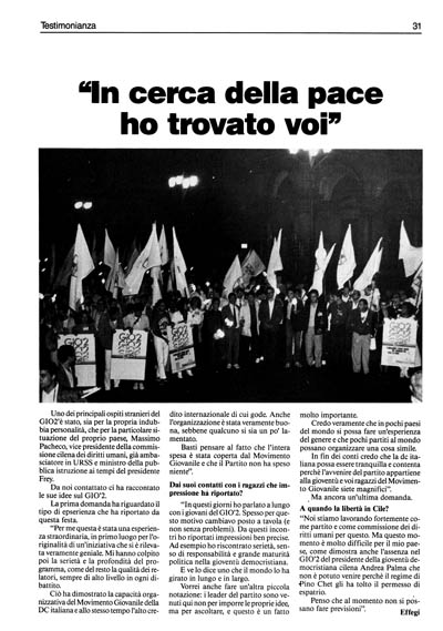 Noi stiamo lavorando fortemente come partito e come commissione dei diritti umani per questo. Ma questo momento è molto difficile per il mio paese, come dimostra anche l'assenza nel GIO'2 del presidente della gioventù democristiana cilena Andrea Palma che non è potuto venire perché il regime di Pinochet gli ha tolto il permesso di espatrio. Penso che al momento non si possano fare previsioni.