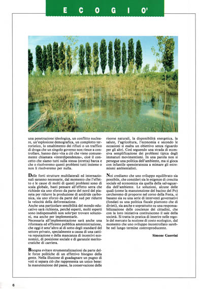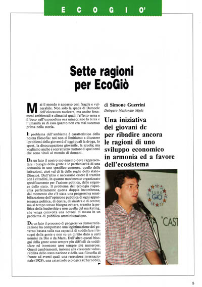 II problema dell'ambiente è caratteristico della nostra filosofia: noi non ci limitiamo a discutere i problemi della gioventù d'oggi quali la droga, lo sport, la disoccupazione giovanile, la scuola; ma vogliamo anche e soprattutto trattare di quei temi che sono vitali al mondo di domani.