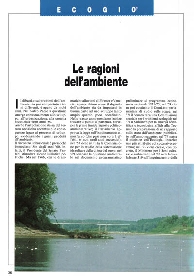 Il dibattito sui problemi dell'ambiente, sia pur con portata e toni differenti, è aperto da molti anni. Nel nostro Paese la questione emerge contestualmente allo sviluppo, all'urbanizzazione, alla crescita industriale degli anni '60.