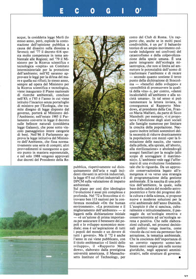 Sul piano per così dire ideologico l'evoluzione è assai più complessa e profonda. Nel '72 a Stoccolma si ritrovano ben 113 nazioni per la conferenza mondiale «On the human environment». «La protezione e il miglioramento dell'ambiente» – si leggerà nella dichiarazione iniziale – «è un'azione di prima importanza per assicurare il benessere dei popoli e lo sviluppo economico mondiale; essa è un'aspirazione di tutti i popoli del mondo e un dovere di tutti i governi». Ma il '72 è anche l'anno in cui viene pubblicato, con il titolo emblematico «I limiti dello sviluppo», il «Rapporto Meadows», elaborato dalla prestigiosa università americana, il Massachusetts Institute of Technology, per conto del Club di Roma. Un rapporto che, anche se in molti passi condivisibile, è un po' il baluardo teorico di un ampio movimento culturale indulgente nei confronti del catastrofismo e della colpevolizzazione della specie umana. È una parte integrante dell'ecologia misantropica, che non si limita ad ammettere le potenzialità dell'uomo di trasformare l'ambiente e di recare – secondo quanto sostiene il terzo punto della dichiarazione di Stoccolma – «benefici dello sviluppo» e «possibilità di promuovere la qualità della vita» o, per contro, «danni incalcolabili all'ambiente e alla società umana». In tal senso si può rammentare la lettera inviata, in conseguenza al Rapporto Meadows, al presidente della Cee, Franco Maria Malfatti, da parte di Sicco Mansholt: per esempio, vi si proponeva l'abolizione degli aiuti sociali alle famiglie numerose per limitare la crescita della popolazione. Nacquero inoltre infiniti sostenitori della necessità di ridurre drasticamente la popolazione con mezzi «per la limitazione delle nascite, che vanno dalla pillola, alla spirale, all'aborto, alla sterilizzazione» e abolendo «gli assegni familiari per la moglie (allo scopo di scoraggiare il matrimonio)». L'ambiente vede oggi l'affermarsi di una evoluzione fondamentale che lo riguarda. Da un approccio conservazionista legato all'emergenza si va verso una strategia di programmazione della gestione ambientale. È la nascita di una politica dell'ambiente, la quale, sulla base della caduta del modello antropocentrico e forte dei progressi della cultura e della scienza, si propone nuove e moderne soluzioni per la crisi ambientale dell'anno Duemila. L'auspicio è che si sancisca, culturalmente e istituzionalmente, il passaggio da un'ecologia emotiva e conservazionista ad un'ecologia serena e positiva. Che nelle elaborazioni culturali, nei processi decisionali politici venga inserita, come vincolo da cui non sia permesso fare astrazione, la tematica ambientale. Che la coscienza dell'importanza di un corretto rapporto uomo/ambiente entri sempre più nelle norme giuridiche, negli apparati amministrativi, nelle strutture di governo.
