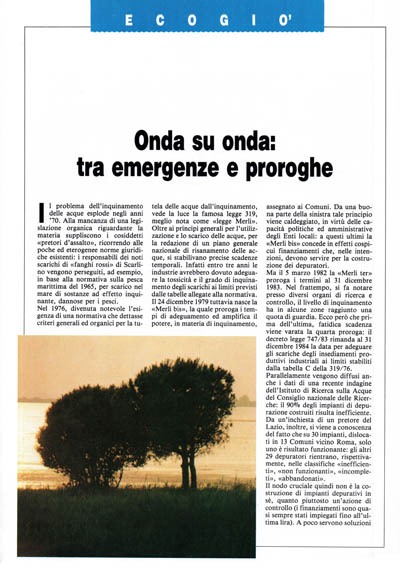 Nel 1976, divenuta notevole l'esigenza di una normativa che dettasse criteri generali ed organici per la tutela delle acque dall'inquinamento, vede la luce la famosa legge 319, meglio nota come «legge Merli». Oltre ai principi generali per l'utilizzazione e lo scarico delle acque, per la redazione di un piano generale nazionale di risanamento delle acque, si stabilivano precise scadenze temporali. Infatti entro tre anni le industrie avrebbero dovuto adeguare la tossicità e il grado di inquinamento degli scarichi ai limiti previsti dalle tabelle allegate alla normativa. Il 24 dicembre 1979 tuttavia nasce la «Merli bis», la quale proroga i tempi di adeguamento ed amplifica il potere, in materia di inquinamento, assegnato ai Comuni. Da una buona parte della sinistra tale principio viene caldeggiato, in virtù delle capacità politiche ed amministrative degli Enti locali: a questi ultimi la «Merli bis» concede in effetti cospicui finanziamenti che, nelle intenzioni, devono servire per la costruzione dei depuratori.