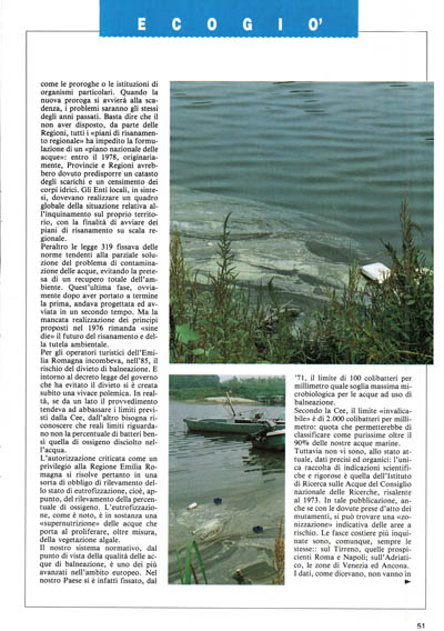 Per gli operatori turistici dell'Emilia Romagna incombeva, nell'85, il rischio del divieto di balneazione. E intorno al decreto legge del governo che ha evitato il divieto si è creata subito una vivace polemica. In realtà, se da un lato il provvedimento tendeva ad abbassare i limiti previsti dalla Cee, dall'altro bisogna riconoscere che reali limiti riguardano non la percentuale di batteri bensì quella di ossigeno disciolto nell'acqua.