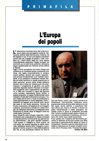 L'attenzione al grande tema dell'unità europea è stata una prerogativa costante, dell'azione politica della Democrazia cristiana, da De Gasperi in poi. E non può essere scambiato quindi solo per orgoglio di partito il voler ricordare tra i meriti storici della Dc l'aver saputo concretamente sostenere l'ideale europeo nel confronto con le altre forze politiche, attraverso tappe caratterizzate da momenti anche difficili e delicati.