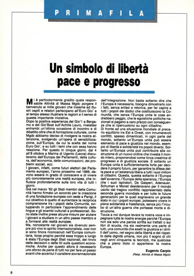 Mi è particolarmente gradito quale responsabile Attività di Massa MGDC porgere il benvenuto ai mille giovani che insieme ad illustri ospiti e relatori partecipano all'Euro Gio' e al tempo stesso illustrare le ragioni e il senso di questa importante iniziativa.