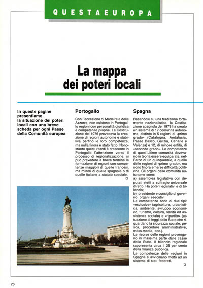 Con l'eccezione di Madeira e delle Azzorre, non esistono in Portogallo regioni con personalità giuridica e competenze proprie. La Costituzione del 1976 prevedeva la creazione di regioni autonome e stabiliva perfino le loro competenze, ma nulla finora è stato fatto. Nonostante questi ritardi è crescente in Portogallo l'attenzione verso il processo di regionalizzazione: si può prevedere a breve termine la formazione di regioni con competenze maggiori di quelle francesi, ma minori di quelle spagnole o di quelle italiane a statuto speciale.