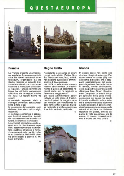In questo paese non esiste una struttura di regioni autonome. Esistono invece le contee (27), con autonomia di bilancio, che si occupano essenzialmente del sostegno integrativo a favore dei comuni (strade, servizi anti-incendio, ecc.). La positiva esperienza della «Shannon Free Airport Development Company», un ente di sviluppo operante nella zona centro-occidentale del paese, ha aperto in Irlanda un dibattito sulle possibilità di stimolare la locale economia a livello di regioni. Il governo irlandese ha recentemente espresso la volontà di studiare una divisione regionale del paese, almeno dal punto di vista economico; ma la natura di questo provvedimento non è ancora del tutto chiara.