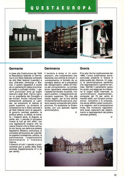 Basandosi su una tradizione fortemente nazionalistica, la Costituzione spagnola del 1978 ha creato un sistema di 17 comunità autonome, distinto in 5 regioni di «primo grado» (Catalogna, Andalusia, Paese Basco, Galizia, Canarie e Valenza) e 12, di minore entità, di «secondo grado». Le competenze di quest'ultime comunità dovevano in teoria essere equiparate, nell'arco di un quinquennio, a quelle delle regioni di «primo grado», ma sono finora emerse difficoltà politiche. Gli organi delle comunità autonome sono: