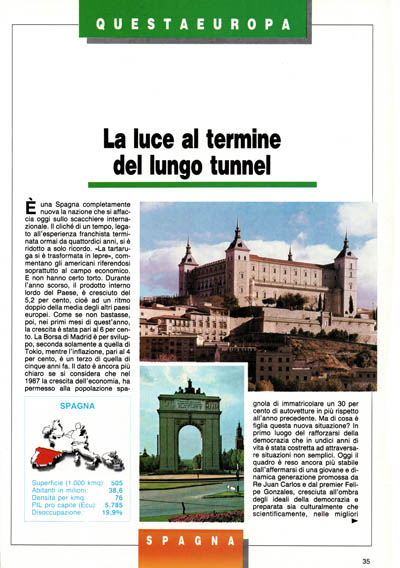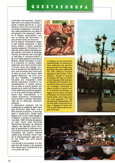 Il referendum popolare che ha mantenuto la presenza della Spagna all'interno della Nato, ma a ben precise condizioni, si può leggere in quest'ottica. Quale potrà essere ora il futuro della Spagna? A Madrid, il domani si riassume in una data: 1992. Entrata da appena un paio d'anni nella Comunità Economica Europea, gli spagnoli vedono nel Mercato unico europeo la possibilità di rafforzare ancora di più le proprie posizioni e di cancellare dal proprio sistema quelle zone d'ombra, come il tasso di disoccupazione oggi pari al 21 per cento, che sono ancora presenti.