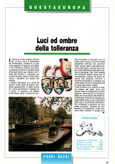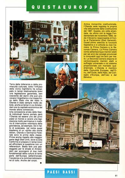 Una concezione errata delle libertà individuali hanno portato però l'Olanda ad essere uno dei primi paesi al mondo a varare una legislazione molto permissiva in materia di interruzione volontaria della gravidanza, ad esempio. Ed in fatto di eutanasia, nel nome quasi blasfemo di un «diritto alla morte dolce», Olanda e Germania Federale sono le prime della classe. Prime anche rispetto alla maggior parte degli Stati Uniti, dove la sola California si prepara in tempi brevi ad affrontare la questione con un referendum. Basta fare una passeggiata per le strade di Amsterdam per accorgersi di due tratti fondamentali della cultura di tanta parte dell'Europa settentrionale: l'opulenza e la commercializzazione di tutto. Anche del corpo.