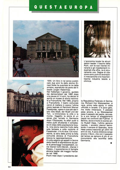 Nel frattempo il governo, guidato dai democristiani dal 1982 dopo una pausa di 14 anni, ha deciso di aprire un museo di storia nazionale a Francoforte. Nel 1985, proprio a Francoforte, il teatro comunale cercò di mettere in scena l'ultima piece teatrale di Reinhold Werner Fassbinder, opera in due atti dal titolo «Die Stadt, der Muell und der Tot», «L'immondizia la città e la morte». Oggetto: la storia di un ebreo che, tornato in Germania dopo l'Olocausto, fa affari puliti e meno puliti sfruttando il complesso di colpa della popolazione locale. Una storia neanche frutto della sola fantasia a volte contorta di Fassbinder, c'è chi dice. Ciò nonostante, la sera della prima la folta comunità ebraica di Francoforte blocca la rappresentazione.