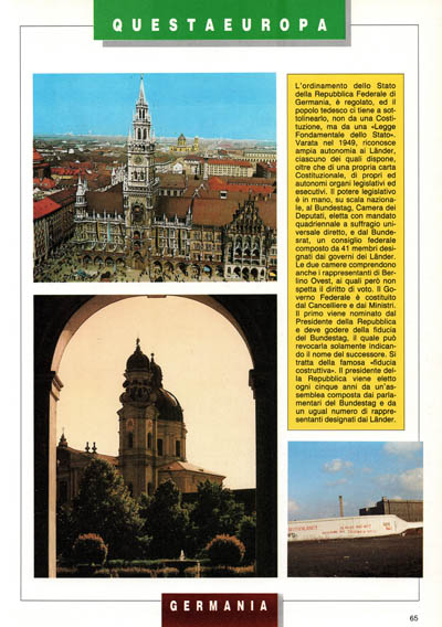 L'ordinamento dello Stato della Repubblica Federale di Germania, è regolato, ed il popolo tedesco ci tiene a sottolinearlo, non da una Costituzione, ma da una «Legge Fondamentale dello Stato». Varata nel 1949, riconosce ampia autonomia ai Lander, ciascuno dei quali dispone, oltre che di una propria carta Costituzionale, di propri ed autonomi organi legislativi ed esecutivi. Il potere legislativo è in mano, su scala nazionale, al Bundestag, Camera dei Deputati, eletta con mandato quadriennale a suffragio universale diretto, e dal Bundesrat, un consiglio federale composto da 41 membri designati dai governi dei Lander. Le due camere comprendono anche i rappresentanti di Berlino Ovest, ai quali però non spetta il diritto di voto. Il Governo Federale è costituito dal Cancelliere e dai Ministri. Il primo viene nominato dal Presidente della Repubblica e deve godere della fiducia del Bundestag, il quale può revocarla solamente indicando il nome del successore. Si tratta della famosa «fiducia costruttiva». Il presidente della Repubblica viene eletto ogni cinque anni da un'assemblea composta dai parlamentari del Bundestag e da un ugual numero di rappresentanti designati dai Lander.
