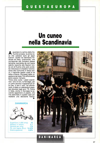 Tra la Germania Federale (paese tra i sei fondatori della CEE) e la Norvegia sta, non solo geograficamente, la Danimarca. Già membro dell'EFTA, l'organizzazione internazionale a carattere economico voluta dal Regno Unito negli anni '50 per creare un contraltare alle nascenti Comunità Europee (CECA ed Euratom), la Danimarca è al pari dell'Olanda uno di quei paesi che ancora adesso mantengono all'interno della CEE un rapporto privilegiato con Londra. Perché le loro economie ancora adesso sono legate a doppio filo a quella britannica. Quando, nel 1983 la signora Thatcher rischiava di far saltare i delicati equilibri dell'integrazione europea facendo levare a gran voce le richieste di una parte della stampa italiana di una serie di misure più che dimostrative nei suoi confronti, la risposta dei più avveduti fu che una Comunità senza il Regno Unito sarebbe stata, oltre che senza senso, anche senza Olanda e Danimarca. Inoltre sarebbe stato impossibile sperare in una richiesta d'ammissione da parte dei paesi scandinavi, una volta consumato il divorzio.